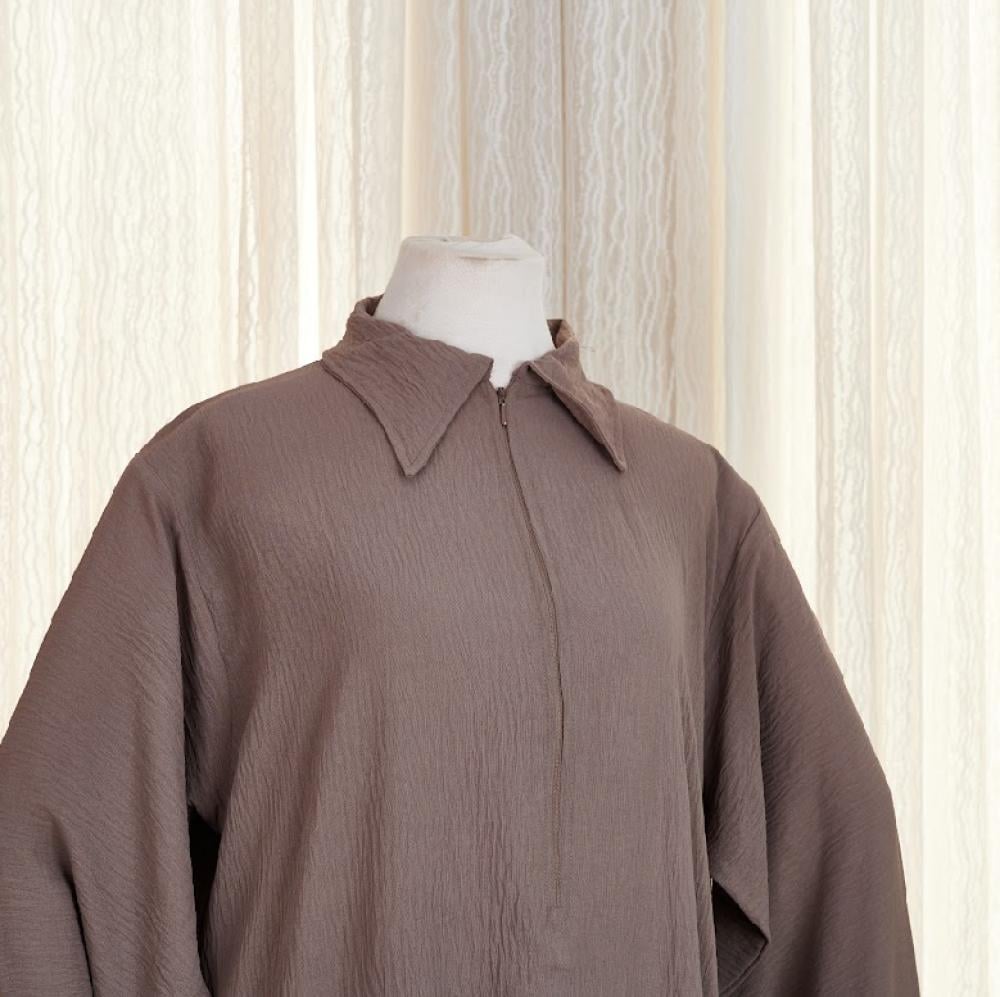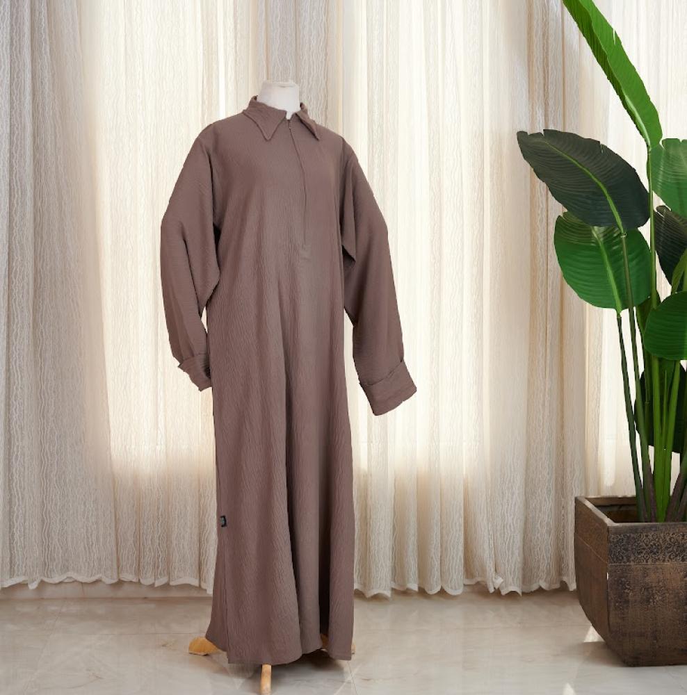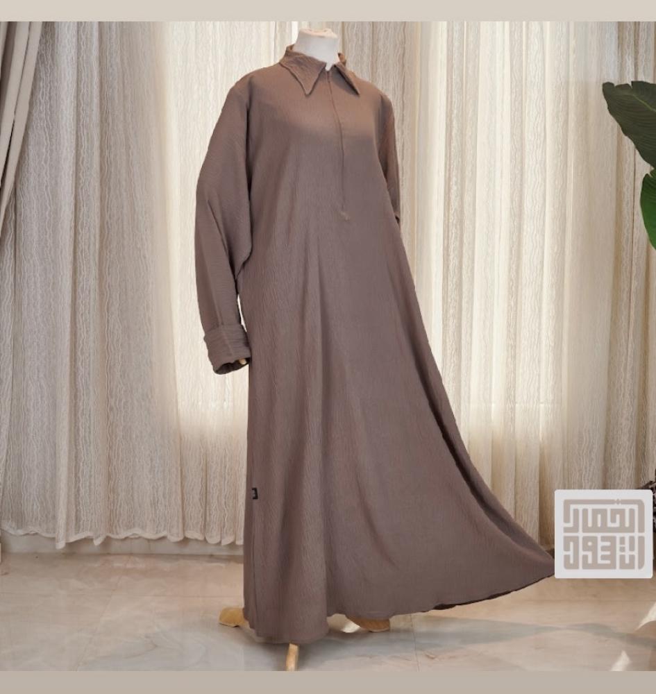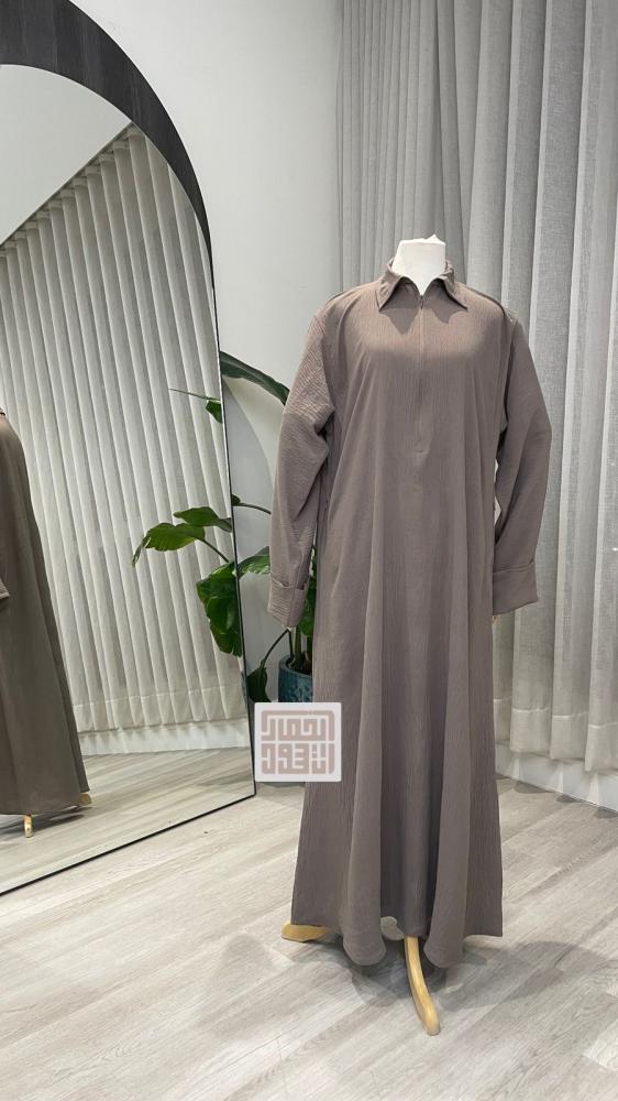 - عبايه بلون لحمي او بيج غامق نص كلوش بسحاب الى المنتصف